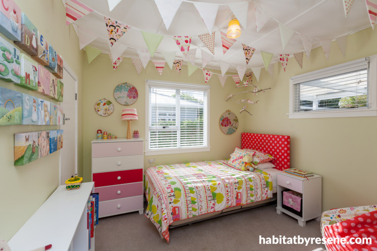 We painted our room in Resene Robin Egg Blue - such a rich, restful colour. Maisie's room is Resene Mint Julep with extra blue tint added. I painted her drawers in various pink shades using Resene testpots.