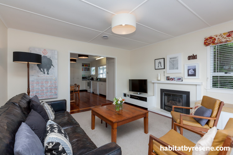 Adam and Kate used a fresh and light palette of a true classic, Resene Pearl Lusta, for the walls in the living room with Resene Quarter Pearl Lusta on the doors and trims.