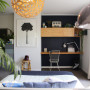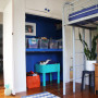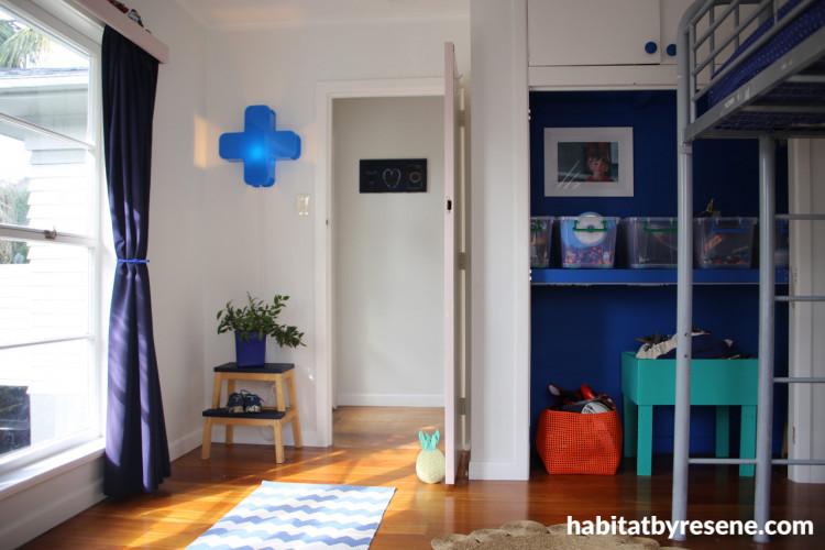 When the kids were really young they shared a room. We took the doors off their wardrobe and built a platform, to make a cosy reading nook. Now this room is Harry's and the Resene Wet N Wild wall makes a great backdrop for his storage.