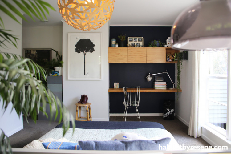 The study nook in our bedroom is Resene Celestial Blue. This makes the space recede and brings the focus to the exposed upcycled pine desk.