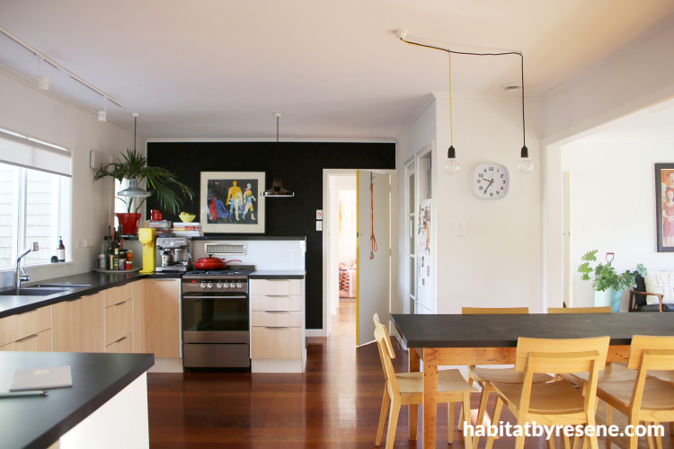 The first thing we did was paint the whole interior Resene Black White with Resene Alabaster trim, slowly adding colour to each room over the years. We managed to save the old wallpaper in our kitchen, which we painted Resene Black.