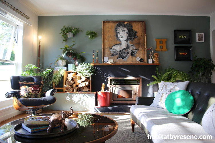 The lounge is painted in Resene Smoky Green, a great backdrop for Kate’s many potted plants (73 and counting!).