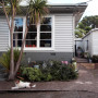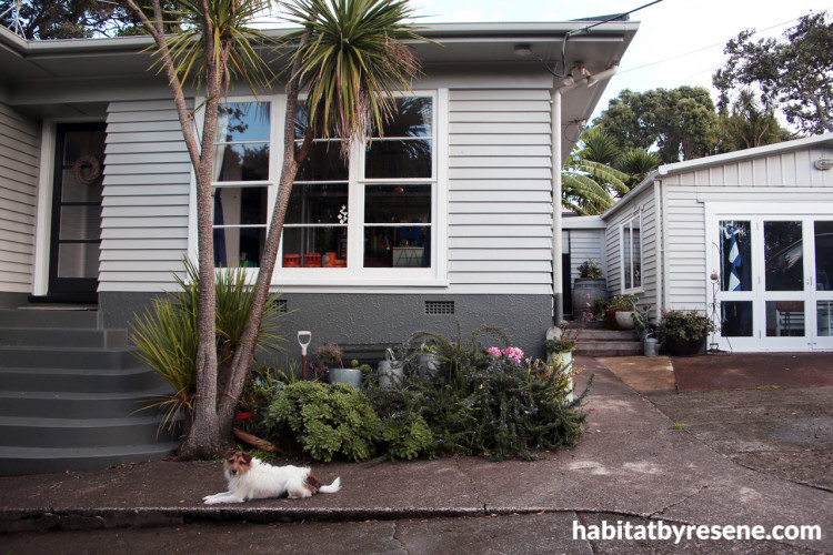 The family's dog Mindy poses in front of the 1950s weatherboard home, painted in Resene Foggy Grey. The roof and doors are painted in Resene Blackjack, the base is in Resene Gravel, and the trim is in Resene Rice Cake.