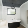 With the bathrooms, we wanted to really make a statement and continue the French theme. I chose to wallpaper the ceilings with a black patterned paper and hang large black chandeliers. This has an amazing effect and gets a lot of comments!
