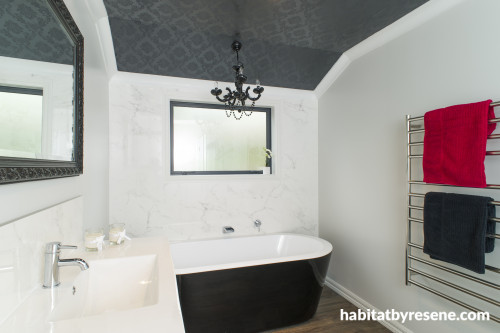 The French theme continues in the decadent bathroom, with its unusual wallpapered ceiling, black chandelier and black bath. The wallpaper shown here is a discontinued line (Resene Aria 76217) but the Resene Simply Silks 2 (SL27548) wallpaper would give you a similar look.