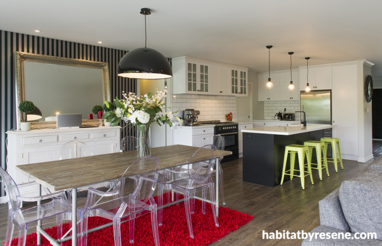 The main living areas and kitchen are painted in neutral colours to provide a restful backdrop to the large open space. Resene Sea Fog is on the walls with trims and doors in Resene Black White. We also used a silver and black striped Resene wallpaper, Black & White 28701, to define and add drama to the dining area.