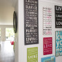 A collection of quirky word art hangs en masse in the entrance foyer. The walls are Resene Sea Fog.