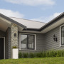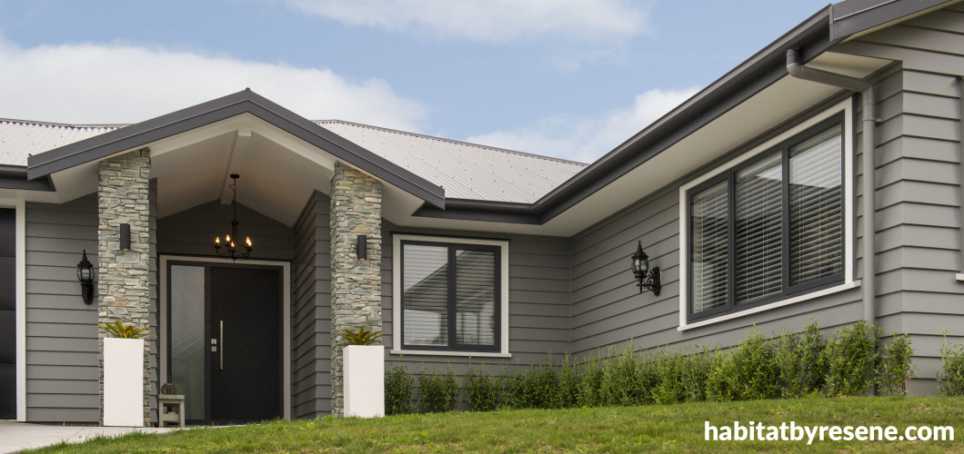 The smartly contemporary exterior features Resene Trojan weatherboards with black joinery and Resene Triple Sea Fog trims.