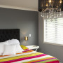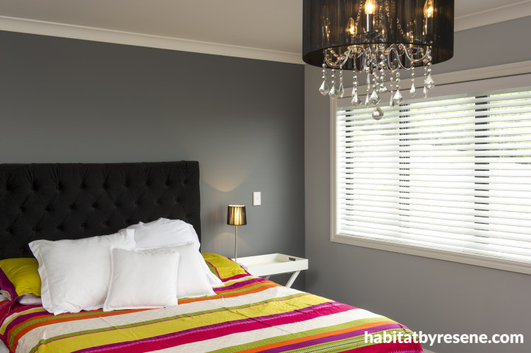 With the bedrooms, Darren gave me a little more free reign. Darren wanted his own bedroom to be his escape, his private sanctuary, so we used the dark, warm colour of Resene Scarpa Flow as a feature wall along with Resene Surrender. As this is a large room, we were able to use strong colours to create a cosy, warm feeling.