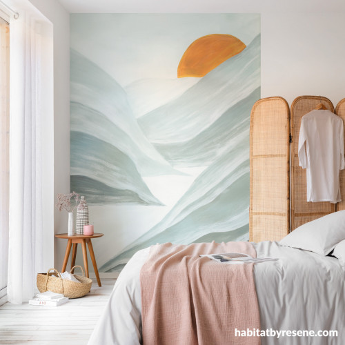 Make your bedroom a tranquil space with a serene mural like Resene Wallpaper Collection ONB102726002. Keep the palette light and bright by teaming it with walls in Resene Alabaster and flooring in Resene Colorwood Whitewash.