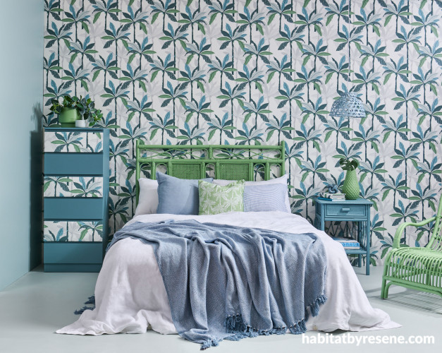 Create tropical coastal charm in your home or bach with Resene Wallpaper Collection 37530-1. Drawers, bedside table and ornament painted in Resene Blue Bayoux, headboard, chair and plant pots in Resene Amulet, rattan pendant in Resene Nepal. Duvet and pillowcases from Foxtrot Home, throw from The Warehouse, Hampton linen striped pillowcase from Ezibuy, light blue cushion cover from H&M Home. Project by Vanessa Nouwens, image by Bryce Carleton.
