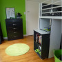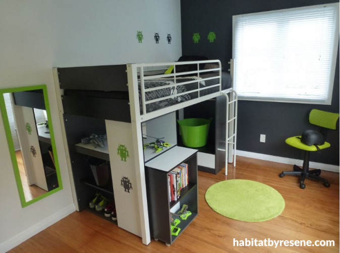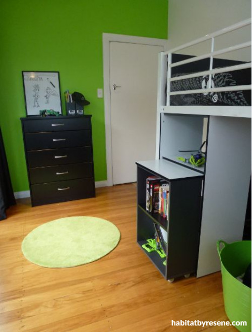 Another view of the bedroom in the main photo. Eleven-year-old son Justin wanted lime and black walls for his bedroom so mum Toni-Maree Gleason gave him one of each, in Resene Dizzy Lizzy and Resene Ebony Clay (see main photo), cleverly balanced that out with other walls in Resene Alabaster. Some robot decals, a round rug and a lime-painted mirror complete the look of this striking room.