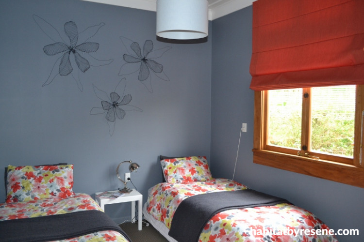 Clever homeowner Jane Eades made these delicate flowers out of chicken wire for her daughter’s room. They sit on a wall of Resene Raven.