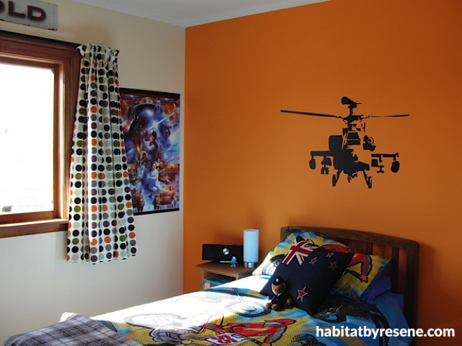 Orange is a great non gender specific colour for any child’s room, no matter what their age. Here, Jenny and Hamish Johnson gave their son Tom’s room a wall of Resene Pizazz (other walls are in Resene Dutch White), then added a Banksy-style wall decal.