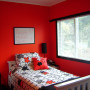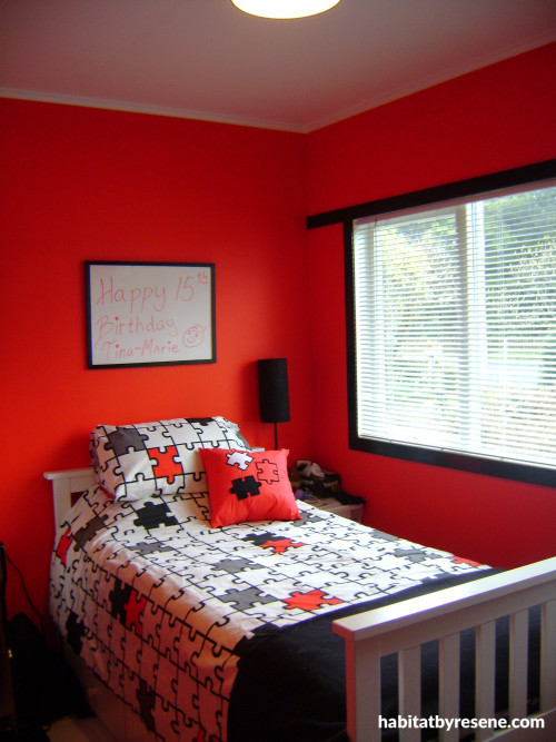 Interior designer Michelle Critchley didn’t hold back when painting this bedroom in Resene Havoc, adding black trims and fun bed linen.