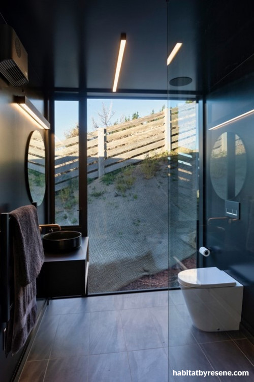 By total contrast, Resene Double Foundry was used on the walls and ceiling of the bathroom to create a cocooning feeling. The result is an elegant spa-like space, where the dark colour is balanced by a floor-to-ceiling window with a private view.