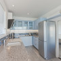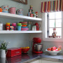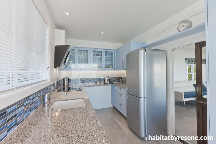 A quirky vintage feel is given to this kitchen with lots of display space for colourful accessories, set against walls in Resene Periglacial Blue.