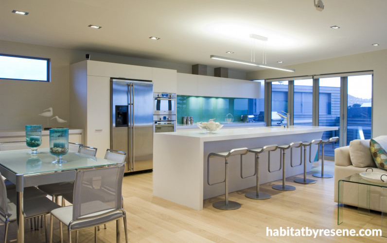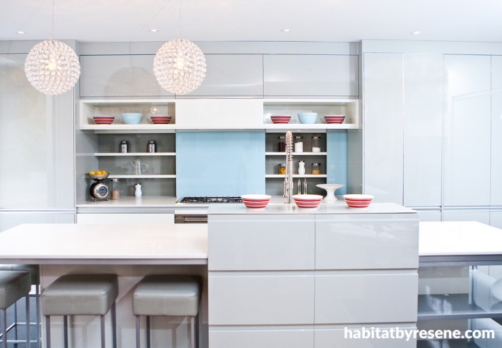 In this kitchen designed by Celia Visser, Resene Fountain Blue is used as a fresh summery accent colour; it’s a shade that’s been used throughout the living area.