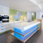 * On a back-painted glass splashback. Bright colours used this way are becoming less popular. Either richer, deeper tones or gelato shades are taking their place.