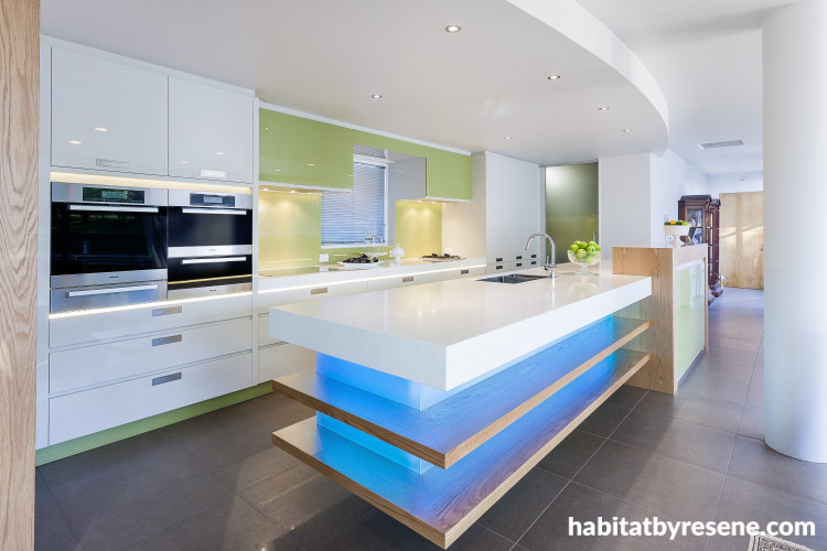This very cool curvy kitchen is designed by Mal Corboy with cabinets in Resene Black White and a splashback in Resene Altitude.