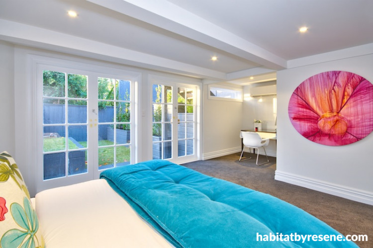 Krista is particularly please with the downstairs master bedroom. "I was scared it was going to be too dark, but with the two sets of french doors it’s not - and it’s divine." The walls are in Resene Black White and the trims are Resene Alabaster.