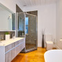 The bathroom continues the neutral scheme, with touches of aged timber finish for extra character.