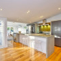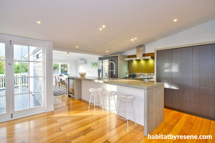 Perhaps the best example of the old meeting the new is the 100-year-old kauri floors next to the state-of-the-art poured concrete kitchen which is the centrepiece of the open-plan living area.