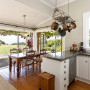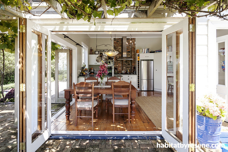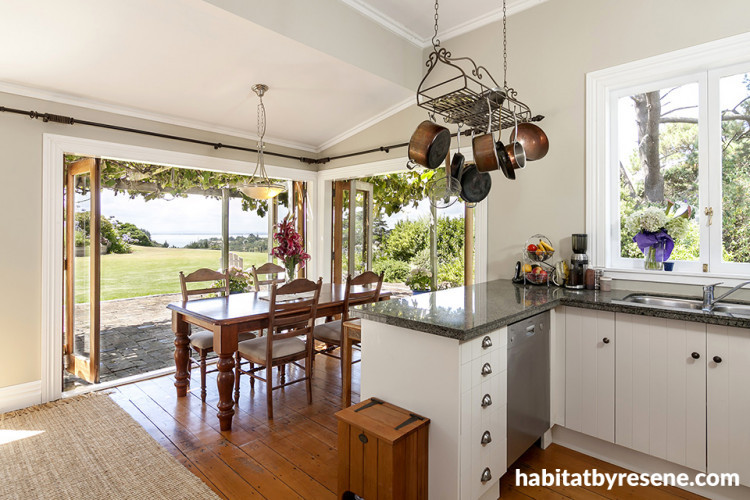 The kitchen and dining area is now painted in Resene Tana, a cool, stony grey, which works with the honeyed tones of the kauri floors.