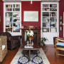When the sun streams in the afternoon, the light dances off the bright red walls. In summer we throw the bi-fold doors open and a breeze wafts right through the house. Our custom-made bookshelves complete the ‘library’ effect.