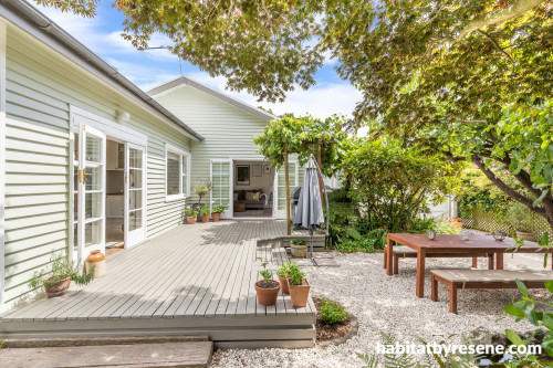 The bungalow’s exterior was also given a pristine makeover. It now sits pretty with weatherboards painted in fresh Resene Green Spring and trims in Resene Orchid White. The kitchen and new sitting area have French doors that lead out to the deck, finished in Resene Lumbersider in Resene Triple Friar Grey. Beyond that is the garden, which means Laura and Jarred could be in the kitchen cooking and baking while still keeping an eye on the kids while they played outside.