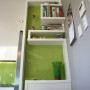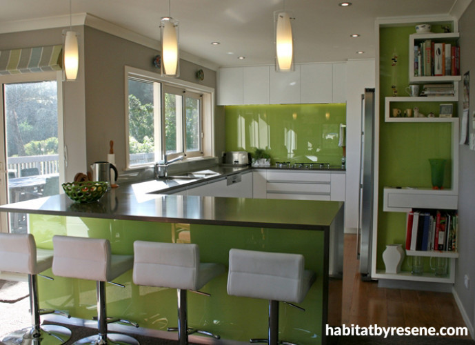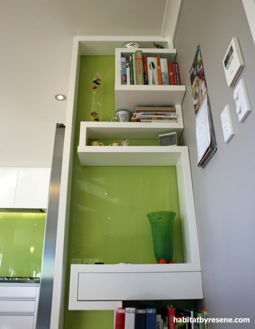 The fresh green of Resene Celery was also used behind this sculptural bookshelf beside the kitchen, on recommendation from the architect Anna Windsor.