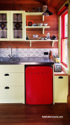 Lizzie had always hankered after red blinds for her kitchen for the way red stimulates the appetite so found colours for the cabinets that balanced the red and worked with the rimu tongue-and-groove ceiling and walls: Resene Havoc (red), Resene Hypnotic (creamy green) and Resene Ship Cove (grey blue).