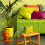 This scheme is full of bright colour, and doesn’t need the relief of white walls or accessories to create a vibrant tropical feel. The wall is Resene Spring Fever, the day bed is Resene Limerick, the pot is Resene Tweet, the cane table is Resene California and the floor is stained in Resene Walnut.
