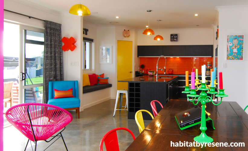Trudy and Mike Nettle's open-plan family area is alive with pops of colour, in furniture and accessories, but also with a pantry door painted in Resene Fizz. It is also finished in Resene Write-on so that it can be used as a message board. This house features in the latest issue of habitat magazine.