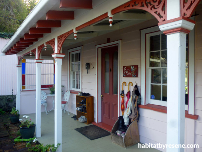 Even an exterior can be treated to a candy-coloured scheme. This cottage has been decked out in pink by Penny Clark, using weatherboards in Resene Dust Storm, darker accents in Resene Cha Cha, a door in Resene Tosca and trims in Resene Soapstone. The veranda boards are Resene Hillary.