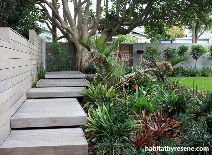 She also raised the lawn level by half a metre, installed a new pedestrian gate to separate foot traffic from the vehicle entry, and planted a sea of bromeliads for the challenging area beneath a large puriri tree.
