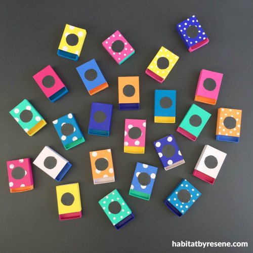 Paint matchboxes in fun colours and patterns, and paint dots in the centre of each with Resene Double Cod Grey. Once dry, use chalk to write the numbers, apply double sided tape to the back, and fill with goodies. You're ready to hang your calendar. Enjoy!
