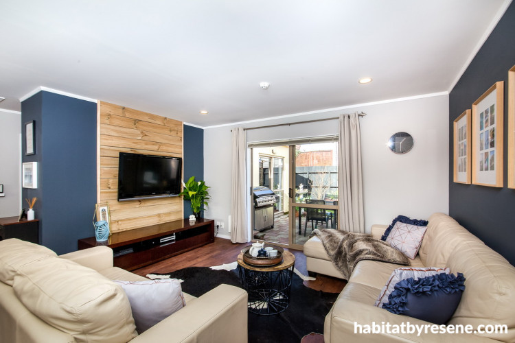 Marcus and Melanie have always been attracted to dramatic colour with wood tones – in the living room they paired Resene New Denim Blue with a feature wooden wall (made from fence palings). The other walls are painted in Resene Eighth Friar Grey.
