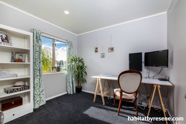 A sunny little study space, painted in Resene Eighth Friar Grey.