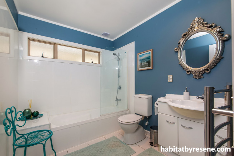 The ensuite bathroom, painted in Resene New Denim Blue.