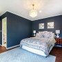 The jewel in the crown is the master bedroom, painted in Resene New Denim Blue. Here, sunlight pours through the three large windows most of the day, and the chandelier and metallic accessories simply glow against the dark blue walls.