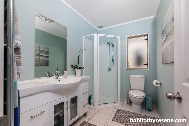 The bathroom has a similar paint scheme, painted in Resene Nebula.