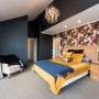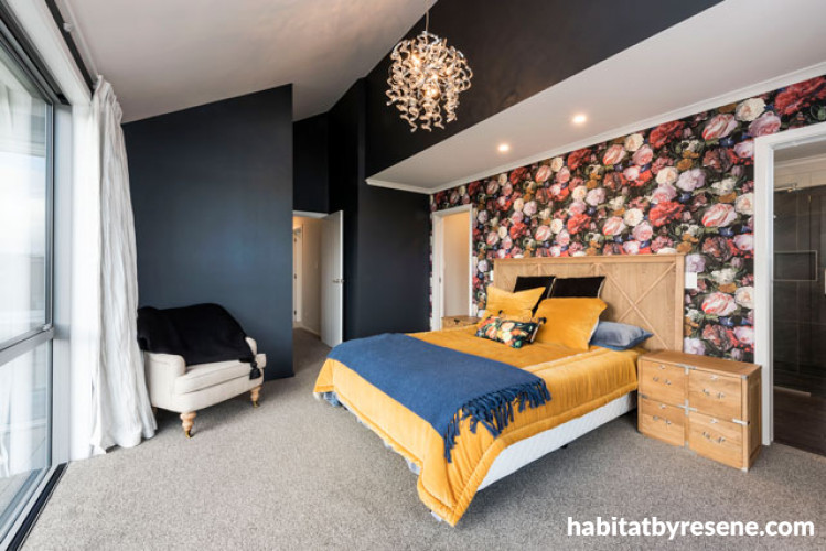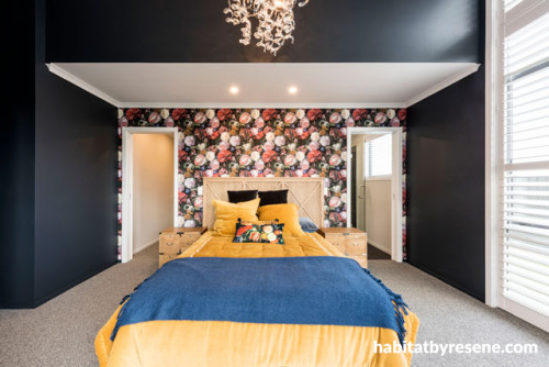 I'm happiest with the master bedroom. Working with the deep charcoal colour already in place, I paired a bold Resene Wallpaper Collection wallpaper available at Resene ColorShops (code E358000). It’s a dark black background floral design with hits of mustards and jewel tones. Because the rest of the home is quite neutral we really wanted the master bedroom to be an unexpected surprise.
