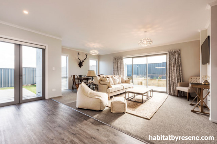We worked with the standard existing Jennian show home colour palette, with the majority of the interior walls painted in Resene Triple Sea Fog. And in the separate lounge Resene Half Friar Grey gives a needed contrast between the areas.