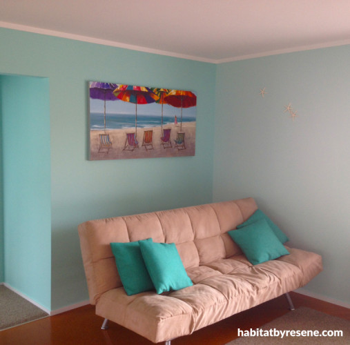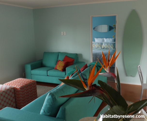 Another view of the lounge, showing off the wonderful flow of the living space into one of the bedrooms. A surfboard hangs on the walls to remind visitors to take it easy, made by Lea and painted in Resene Serenity.