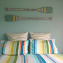 A nod to the adventures that await outdoors, salvaged wooden oars hang on this bedroom wall painted in Resene Shadow Green.