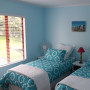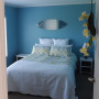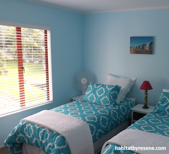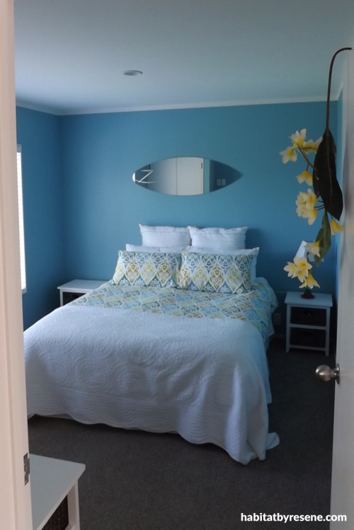 The second bedroom is painted in aquamarine Resene Meltwater, mirroring the sea views found beyond the window. Resene Alabaster on the ceiling anchors the scheme, and is used throughout the house.