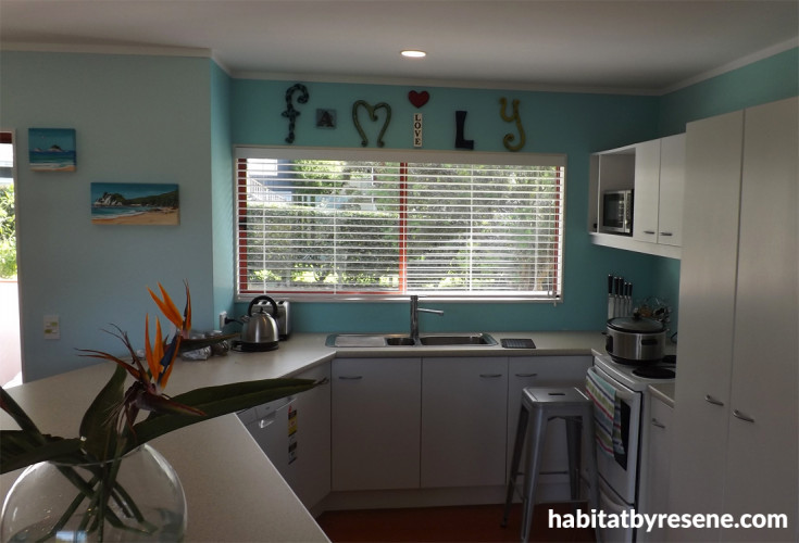 The lounge flows into the kitchen, painted in Resene Onepoto.
