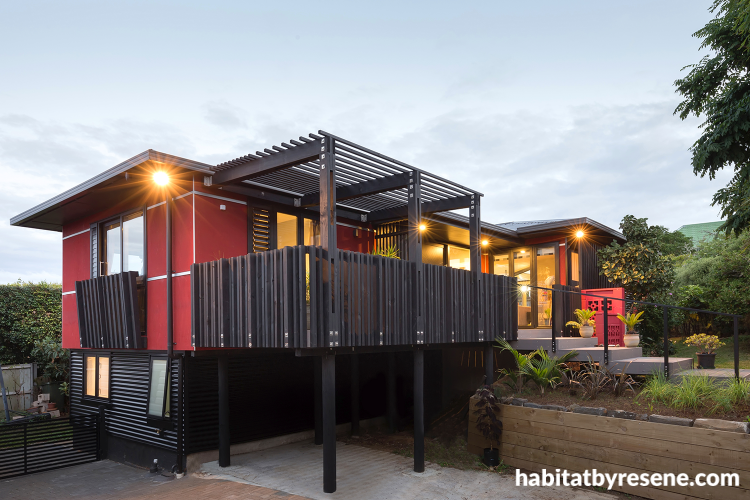 Another view of the exterior showing more of the Resene Red Pepper cladding. The deck balustrade is in Resene All Black.
