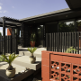 Shadowclad and decorative blockwork painted a rusty red (Resene Red Pepper), paired with pergolas and deck balustrades in Resene All Black and black True Oak Corrugate metal.